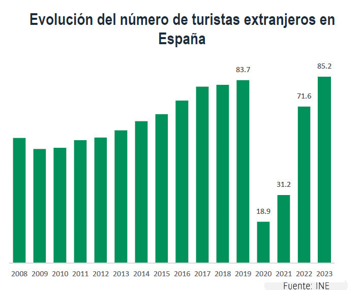 El turismo internacional ha batido récords este año con más de 85 millones de visitantes, un incremento del 19% respecto a 2022. Reino Unido se mantiene como el principal mercado emisor de turistas hacia España, seguido de Francia y Alemania. Este dinamismo turístico se refleja en indicadores clave como la tarifa media diaria (ADR), que se sitúa en 110,1 €, un 9,1% más que en el año anterior. De igual manera, el ingreso por habitación disponible (RevPAR) ha experimentado una subida significativa del 15,67%, alcanzando los 74,4 €.